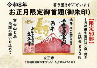 【令和8年お正月限定御首題】 立正寺(身延山宮崎別院)の、お正月限定の御首題(御朱印)です。 御首題とは、日蓮宗版の御朱印ともいえます。髭題目と呼ばれる特殊な筆法の「南無妙法蓮華経」の…続きを読む