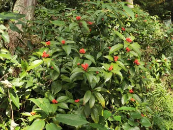 冬至を迎え、参道を登って行くと中段辺りの左斜面に千両の赤い実が沢山なっていました。 千両の花言葉=「裕福」「利益」だそうです。観て、ありがたく思えます。 *収穫や持って帰るのは禁です。