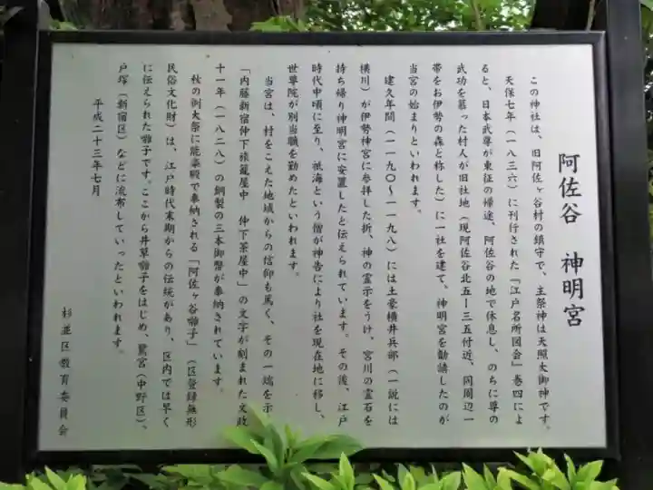 天保七年(一八三六)に刊行された『江戸名所図会』巻四によると、日本武尊が東征の帰途、阿佐谷の地で休息し、のちに尊の武功を慕った村人が旧社地(現阿佐谷北五-三五付近、同周辺一帯をお伊勢の森と称した)に一社を建て、神明宮を勧請したのが当宮の始まりといわれます。