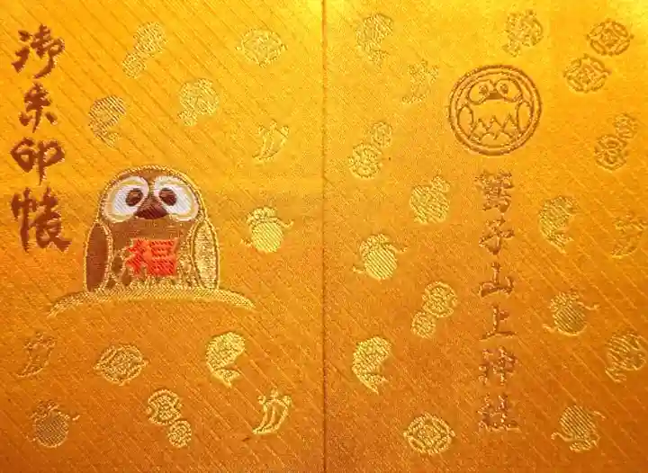 黄色の地に縁起物が散りばめられた御朱印帳で、表面は真ん中に大フクロウ(不苦労)像がデザインされ、左上に御朱印帳の文字、裏面はフクロウの意匠と鷲子山上神社の文字が入っています。