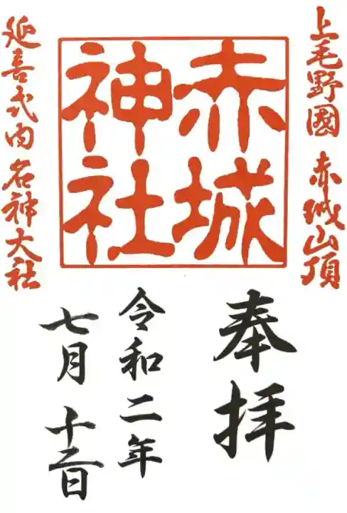 上部真ん中に赤城神社の印、右上に「上毛野國 赤城山頂」の印、左上に「延喜式内 名神大社」の印が押されています。